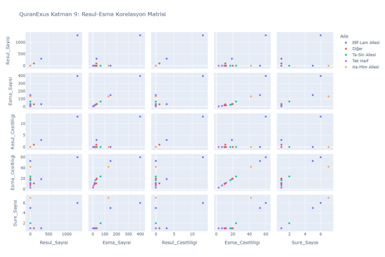• Kavramsal Omurga: QuraNexus, metnin derin yapısal korelasyonlarını (ilişkilerini) araştırmak için tasarlanmıştır. Metnin “anlamsal omurgasını” oluşturan Esma (İlahi İsimler) ve Resul (Elçi) kavramları ile sure başlarındaki gizemli Huruf-u Mukatta (Kesik Harfler) arasında istatistiksel ve semantik bir ilişki var mıdır? Bu, metnin kendi kendini doğrulayan bir iç mimarisinin kanıtı olabilir mi?